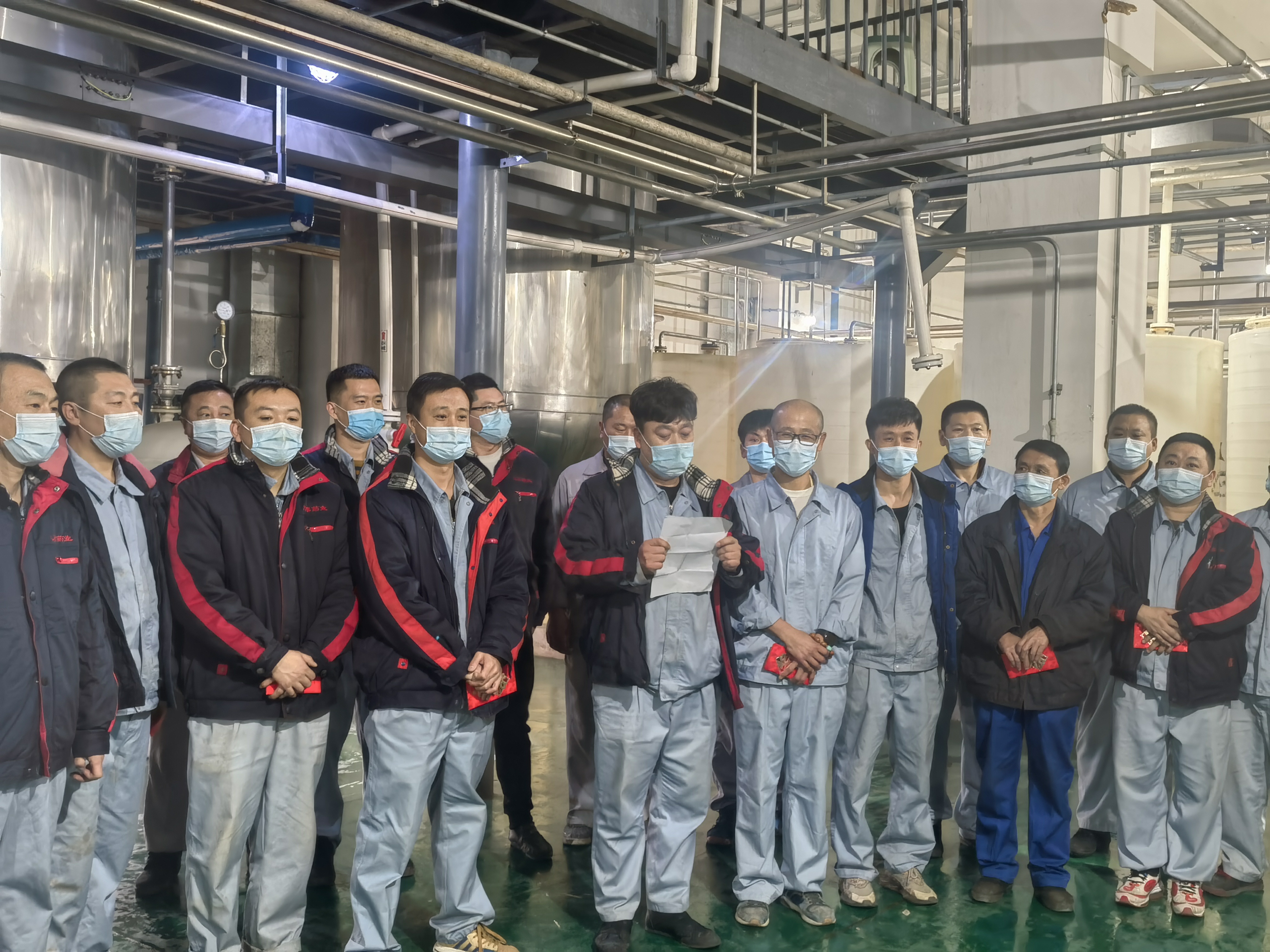作為保供企業(yè),為了滿足市場藥品需要,公司重點(diǎn)供應(yīng)藥品的生產(chǎn)不能停。經(jīng)過向上級疫情防控指揮中心申請獲批準(zhǔn)后,公司研究決定,在原料生產(chǎn)總監(jiān)劉剛組織下,在鑫泰基副總經(jīng)理劉新華、原料車間副主任馬尚、于洋帶領(lǐng)下,原料車間的32名一線員工他們甚至都沒有時(shí)間來得及安頓好家人,毫不猶豫的從29日起,就開始日夜堅(jiān)守在了工作崗位上。由于人員有限,生產(chǎn)任務(wù)艱巨,他們每個(gè)人的工作量都要超出平常工作強(qiáng)度,有些員工常常深夜還忙碌在生產(chǎn)崗位上,有時(shí)天還沒亮,就又開始了新一天的工作。白天他們加緊生產(chǎn),晚上就睡在潔凈區(qū)、操作間、休息室、辦公室臨時(shí)準(zhǔn)備的鋪蓋上,窄小的折疊床上。由于緊張的工作頻率,又不能夠很好的休息,很多員工感冒了,但他們沒有一個(gè)人退縮,沒有一句怨言,吃著感冒藥、消炎藥在崗位上堅(jiān)守了十余天,保質(zhì)保量完成了生產(chǎn)任務(wù)。
